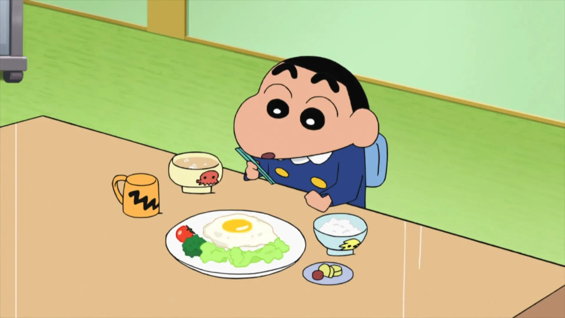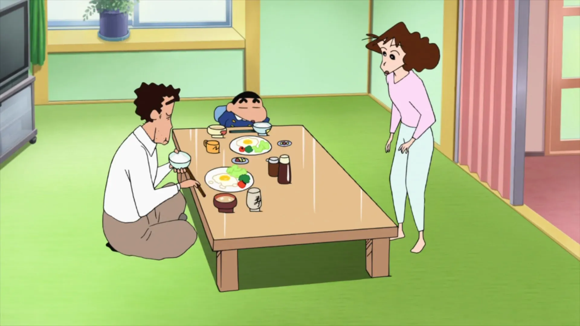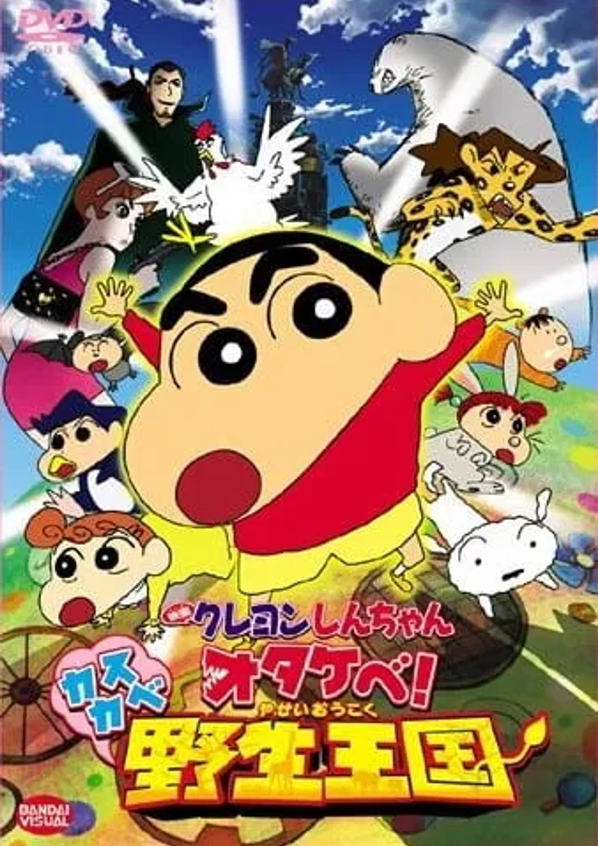 Comical action adventure film including a caricature of radical ecoactivism and theme of bond between mother and children. The new mayor of Futaba Town, Kasukabe-City, Saitama Prefecture, Mamoru Shizan promotes ecology activities, but his true identity is the leader of an eco-terrorist organization "SKBE: Save Keeping Beautiful Earth", and he launches a plan to transform human into animals by making them take a drink to change into animals. By taking the drink, Shinnosuke's father, Hiroshi changes into a chicken, and his mother changes into a panther. With a mystery woman Victoria, the Nohara Family and half-animalized members of Kasukabe Defense Forces fight against SKBE to stop Shizen's plan. (Source: Manabu Tsuribe)