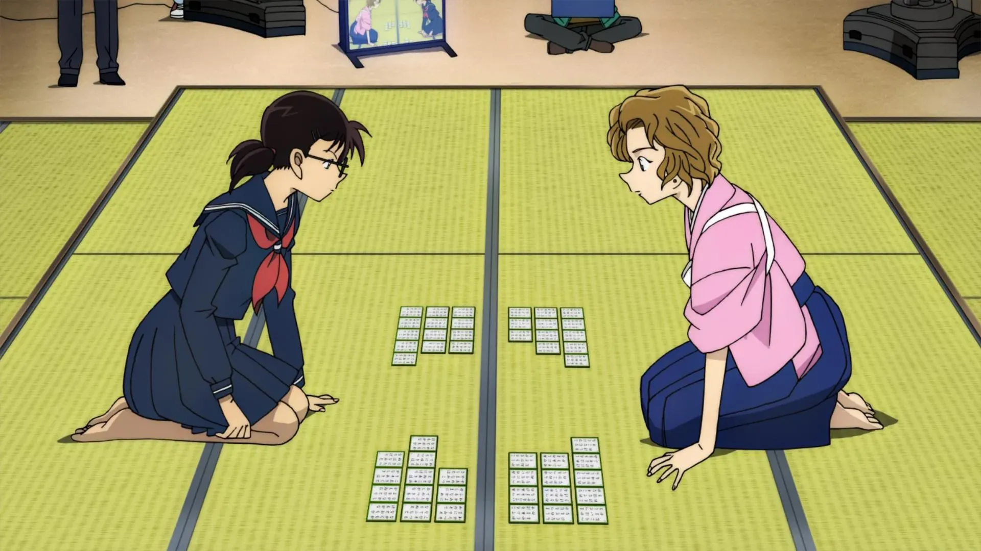 A bombing case at Nichiuri TV in autumn. The Satsuki Cup, which crowns the winner of Japan's Hyakunin Isshu, is currently being filmed inside the facility. The incident results in a big commotion and, while the building is burning to ashes, the only people left inside are Heiji and Kazuha. They get rescued just in time by Conan, who rushes to the scene. Both the identity and purposes of the bomber are unknown. While confusion takes over due to the explosion, Conan meets a mysterious beautiful girl who claims she is "Heiji's fiancée". Her name is Momiji Ooka and she is the Kyoto High School champion of the Karuta game. As fate would have it, Kazuha is going to face Momiji in the Hyakunin Isshu, so she begins to train with the help of Heiji's mother, Shizuka, who is a skilled Karuta player. At the same time, in a Japanese house in Arashiyama, Kyoto's outskirts, the reigning Satsuki Cup champion is murdered. Pictures of the crime scene reveal Momji's presence. Additionally, several Karuta cards were spread around the victim. Conan and Heiji, along with the Osaka and Kyoto police departments, begin their investigation on the Satsuki Cup and the related murder case. As the inquiry goes on, they come across a secret connected with the Hyakunin Isshu. (Source: Detective Conan Wiki)